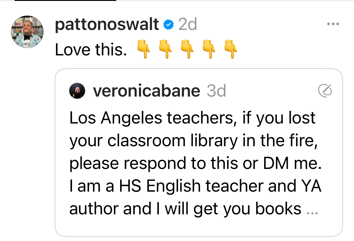 The Google form for donations and requests soon had hundreds of submissions while teachers have been texting her with photos of their burned classrooms and stories of the loss. A nearby independent bookstore, Chevalier’s Books, offered “an incredibly generous donation,” she says. She has heard from fellow authors and members of the children’s literature community who are ready to send their titles and are talking to their publishers about sending more. She has quickly developed a system for sorting the titles she has and creating a manageable flow of future donations.